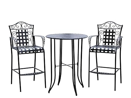 Features: Made from premium powder coated iron All-weather and water resistant outdoor finish Comes with 2 Bar-height patio bar stools with arms and foot rest UV light fading protection against harsh outdoor sunlight Made with a beautiful distressed antique black finish Deep seated and high back for maximum comfort Seating weight capacity of 350 lbs Perfect for patio areas, sun rooms, indoor and outdoor bar areas etc.